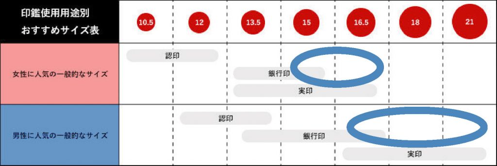 ただ女性で大きな印鑑(はんこ)を好まれる方もいらっしゃいますので、絶対にこのサイズでなければいけない、と言うわけではありませんが、