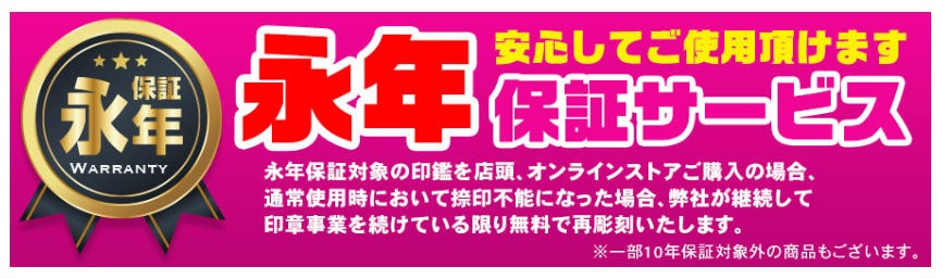 そこで弊社は創業20年を越えて営業させていただいている事もあり、この度、お客様が購入された「永年保証」対象の印鑑につきましては弊社が継続して印章事業を続けている限り、文字通り「永年保証」としてサポートをさせて頂きます。